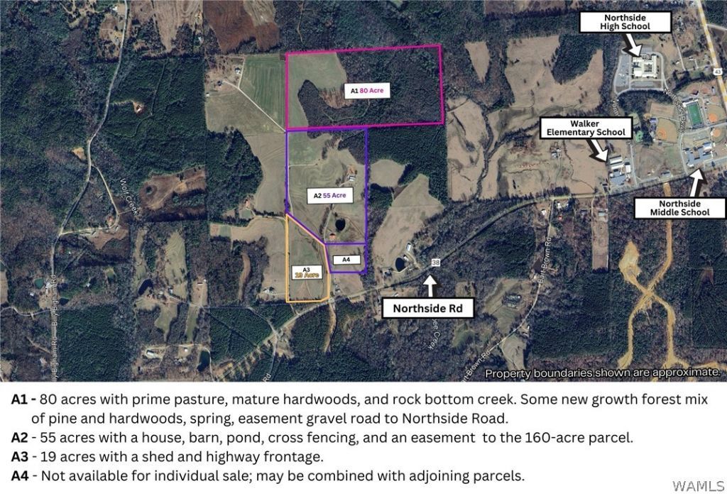 Barbee Creek Preserve is a rare 320± acre offering in Northport, AL, located adjacent to Walker Elementary and Northside Middle & High School. This beautiful property features a mix of rolling pastures, hardwoods, creeks, ponds, and multiple barns/homes, and is currently being used as a working cattle farm. The property is being offered as a whole 320-acre tract, but the Seller is also open to selling in smaller parcels depending on buyer preference. Marketing materials and photos may show proposed parcel divisions labeled A1, A2, A3, B1, B2, B3, and B4; however, these are for illustrative purposes only and are not part of a recorded survey. Final parcel boundaries, acreage, access, and easements are subject to Seller approval and a new survey. This is a unique opportunity for a buyer seeking a large recreational tract, homesite potential, investment property, or future development in a prime location within the Northside school zone.